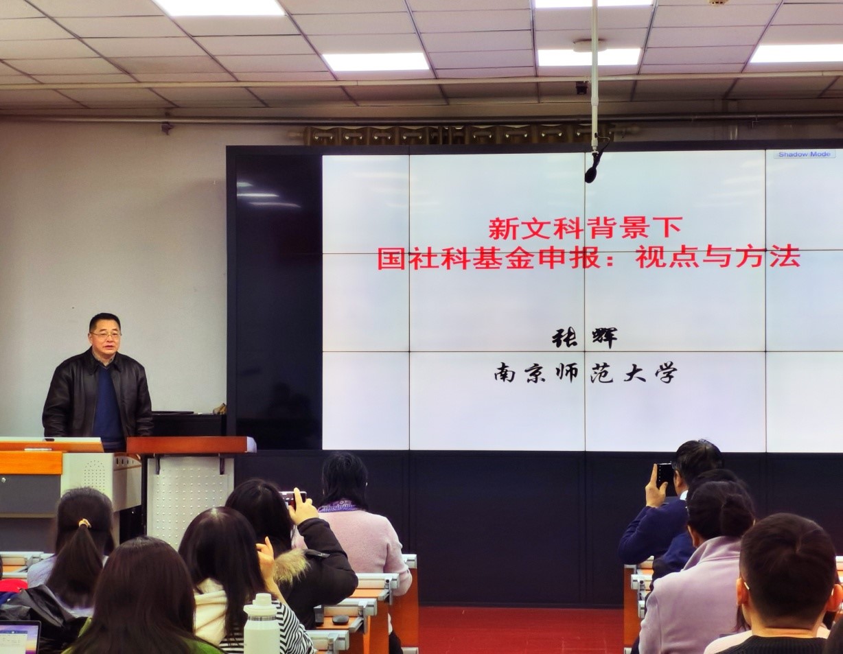 会议伊始,由南京师范大学张辉教授作了题为“新文科背景下国家社科基金项目申报:视点与方法”的专题报告,张辉教授指出新文科建设是指哲学社会科学与新一轮科技革命和产业变革交叉融合形成交叉学科、交叉融合学科及交叉专业的新文科的一系列建设事项和建设工作,具有战略性、创新性、融合性、发展性等特征。其后,他从课题规划、选题的来源展开,提到课题选题是申报成功的关键,是课题的生命。接着从申请书论证时的注意事项、各部分的比例分配、文献史梳理、选题的价值和意义、框架思路、研究方法及创新之处等方面逐一举例讲解说明,指出课题论证是课题申报成功的保障。最后,他总结道:申请书的撰写关键是选题,核心是内容,基础是思路,前提是成果,根本是创新,印象是加分。报告结束后,张辉教授耐心解答了与会教师提出的问题。