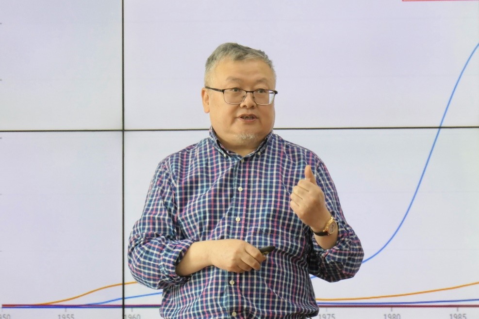 刘海涛教授首先介绍了“人文”和“数字/数据”的概念,并呈现了二者从原本无关到相互结合的历史发展轨迹。他指出,在当今的数据智能时代,机遇与挑战并存,人文学科研究者参与到数智浪潮当中,同样能为现代化建设作出卓越的贡献。随后,刘海涛教授从语言研究的角度出发,将数字人文总结为从大量数据中探寻规律和模式,形成网络,最后生成智能的过程。他表示,数字人文研究要努力从“细读”走向“远观”,细读的方式难以发现文本的一般结构模式,而通过可视化这种“远观”的方法,我们能够发现、解释人类行为的模式及人与社会、自然交互的规律,从而更准确地预测人类和社会的未来。刘海涛教授以诺贝尔奖获得者的信息和美国总统选举的可视化分析为例,进一步阐释了可视化方式的优势。接着,刘海涛教授将目光聚焦在了数字人文视域下的语言、文学、翻译研究,提出文学背后也存在着数学定律,即齐普夫定律。他介绍道,在数据驱动下,研究者能够对文本的语体和内容进行规律性的总结,并随后介绍了《飞鸟集》三个译本与原著风格的相似性、壮族民歌背后的稻作民俗、斯拉夫语分类以及通过文本特征区分假新闻等研究,为数字人文研究提供了具体的范例。在讨论环节,在座师生与刘海涛教授围绕讲座主题内容进行了探讨,讲座在融洽的交流氛围中结束。