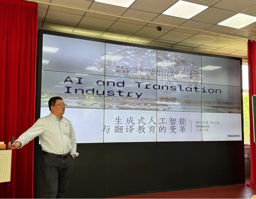 4月26日下午,浙江大学何文忠副教授应邀做客天游ty8检测中心官方登录2024年第6期“知新沙龙”,为全院师生作题为“生成式人工智能与翻译教育的未来”的学术报告。讲座由天游ty8检测中心官方登录院长马文主持。