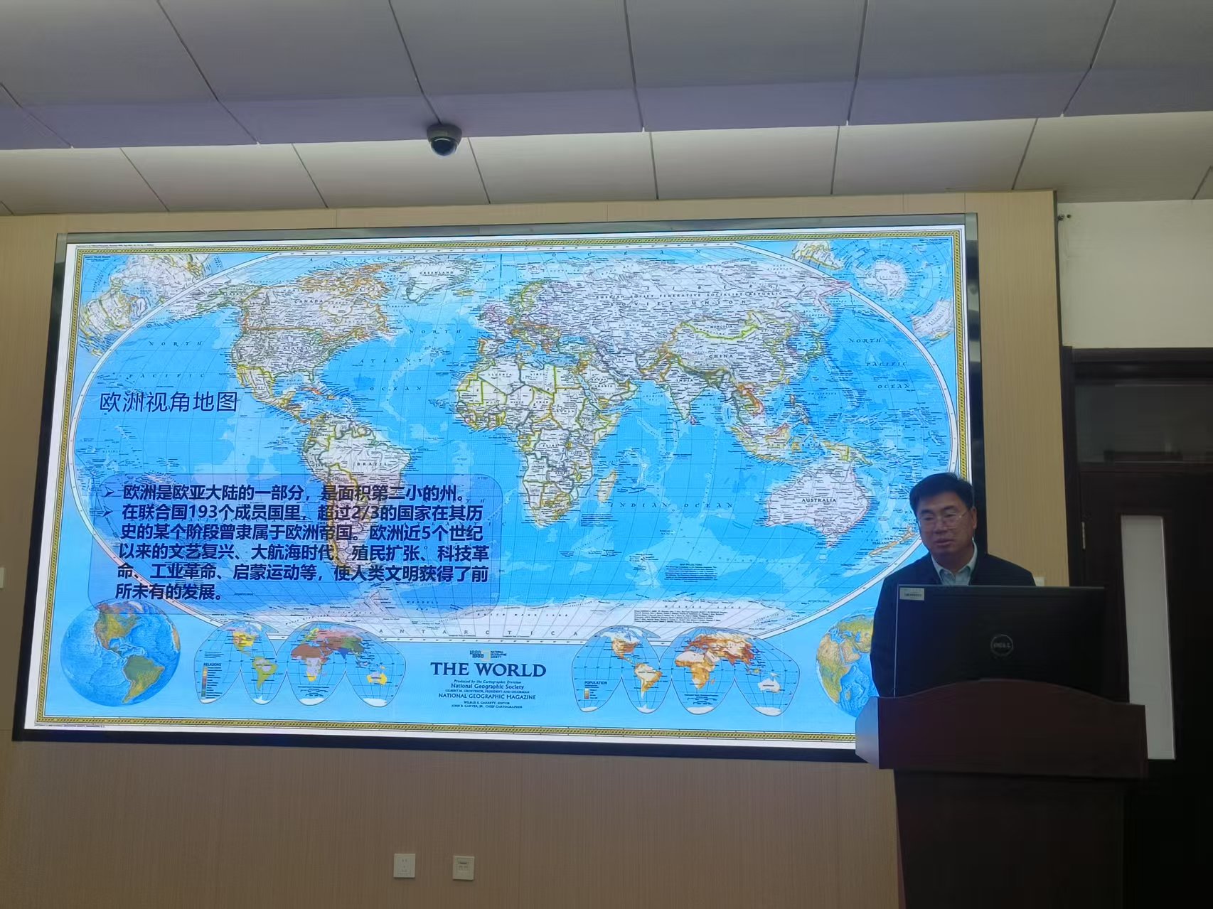 讲座伊始,周家伦介绍了省委外办欧洲处的主要职责,以及与山大欧洲研究中心等山东高校外事智库合作情况。通过展示欧洲视角下的世界地图,他引导外语专业学子辩证看待欧洲文明,指出在破除"欧洲中心论"迷信的同时,也须客观认识欧洲文明对西方文明、现代文明发展的突出贡献。随后,周家伦以“何以欧洲”为题,简述了欧洲自然地理、气候环境、古希腊古罗马历史、基督教传播以及日耳曼人特性对欧洲文明演进的决定性影响。