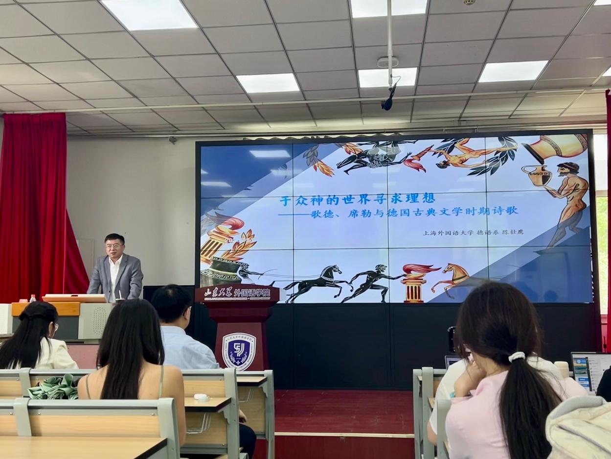 5月12日下午,上海外国语大学研究生院院长、德语系主任陈壮鹰教授做客天游ty8检测中心官方登录2025年第3期“文渊论坛”,为学院师生作题为“歌德与席勒:解读德国古典诗歌巅峰”的学术报告。本次讲座由天游ty8检测中心官方登录院长马文教授主持,德语系庞娜娜教授、讲师李晓艳等参与学术研讨。