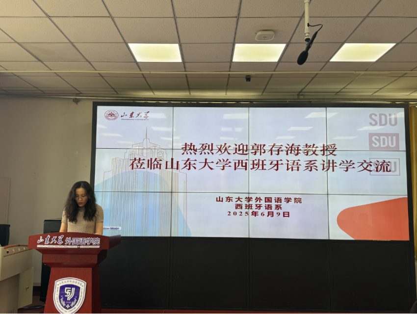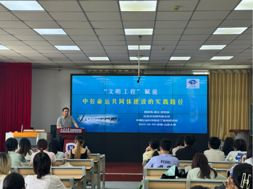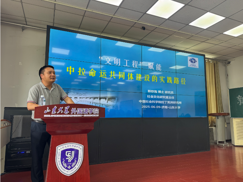 2025年6月9日,中国社会科学院拉丁美洲研究所社会文化研究室主任、阿根廷研究中心主任、中国社会科学院大学国际政治经济学院教授、中国社会科学院“中拉文明交流互鉴研究”创新项目负责人郭存海教授应邀来到天游ty8检测中心官方登录,开展题为 “文明工程赋能中拉命运共同体建设的实践路径”的学术讲座。西班牙语系主任张沁园副教授主持讲座,西班牙语系全体师生参加了此次活动。