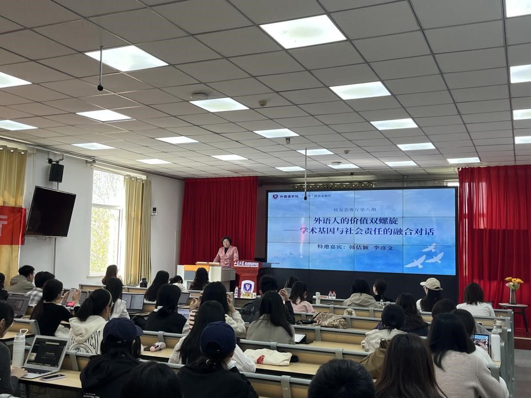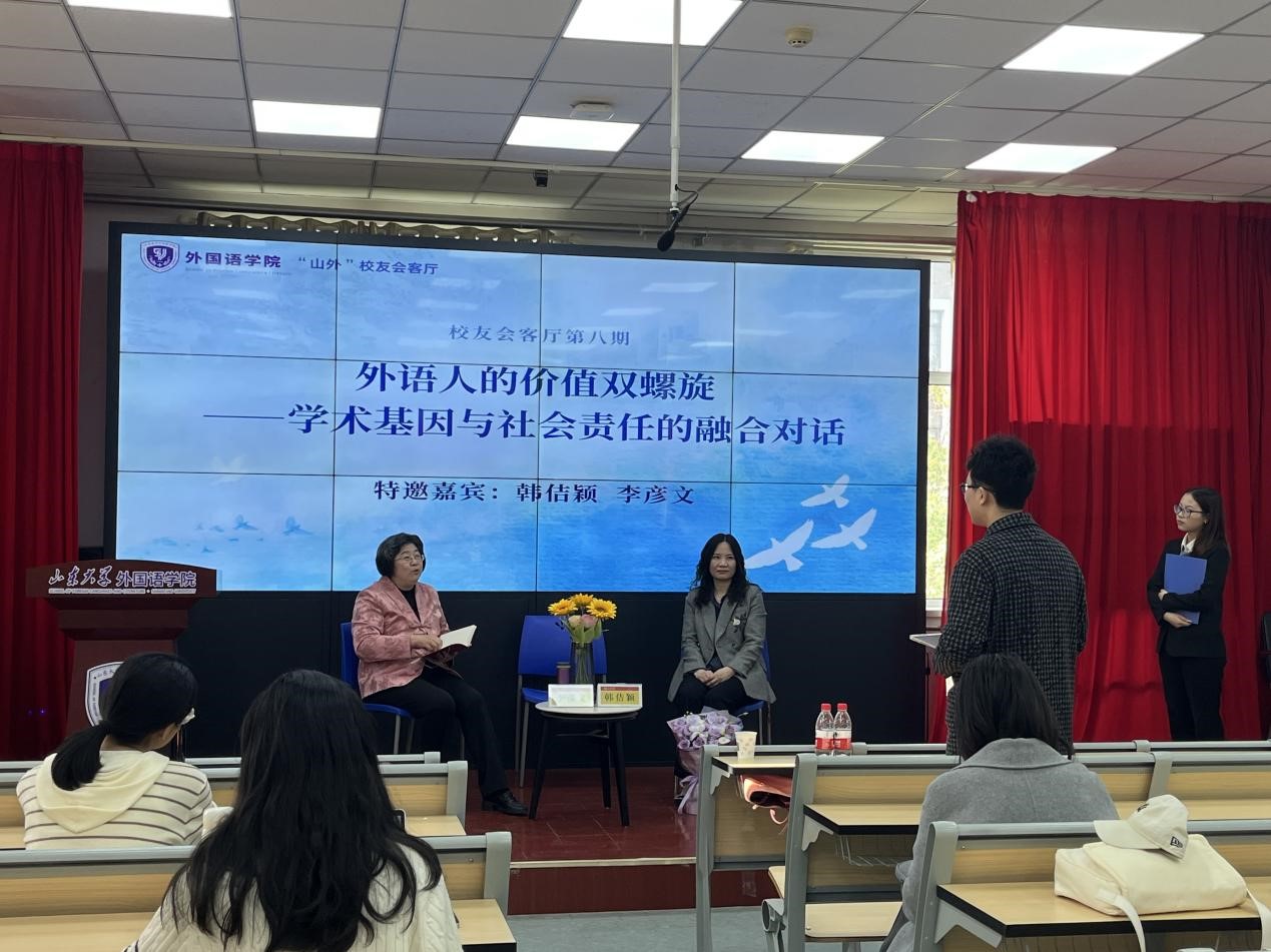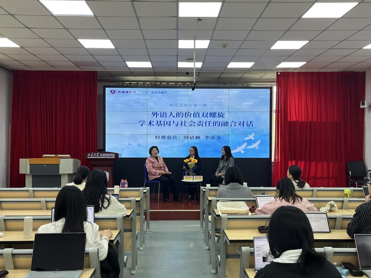 4月13日下午,天游ty8检测中心官方登录成功举办了第八期“山外”校友会客厅活动。本期活动以“外语人的价值双螺旋——学术基因与社会责任的融合”为主题,邀请天游ty8检测中心官方登录90级校友、翻译系教授李彦文,天游ty8检测中心官方登录97级校友、英语系教授韩佶颖担任主讲嘉宾,2022级英语专业本科生陈曼妮主持,来自各年级近100名学生参加活动。