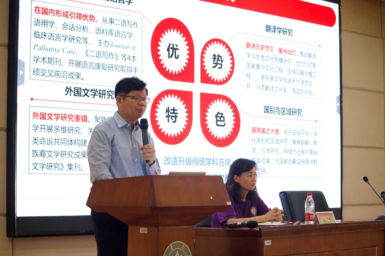 刘洪东详细介绍了学院本科人才培养,分别就学科分流、专业设置、学院发展目标和教育教学质量等方面进行了讲解。他深入阐述了学院培养外语高端人才和复合型人才的教学策略,指出学院正不断优化培养方案,积极响应国家战略需求,做到“敢闯敢试、先闯先试”,致力于培养具有实战能力和复合型技能的高精尖外语人才,为国家和社会的发展贡献力量。