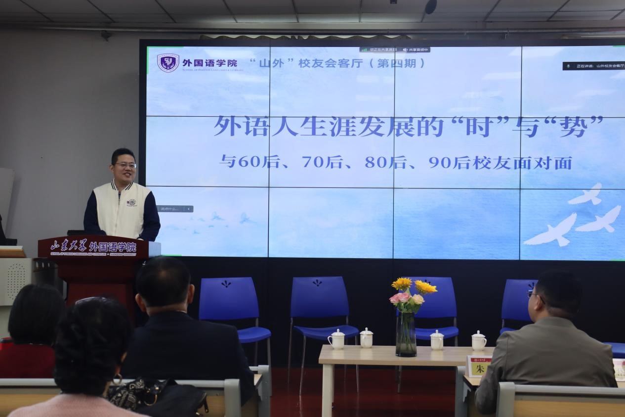 10月20日,由天游ty8检测中心官方登录举办的第四期“山外”校友会客厅活动成功举办。本次活动主题为“外语人生涯发展的‘时’与‘势’——与60后、70后、80后、90后校友面对面”,邀请了1980级优秀校友张心宏、1997级优秀校友朱子杰、2000级优秀校友王瑞敏、2012级优秀校友孙岱霖与在校学生进行分享。天游ty8检测中心官方登录党委副书记魏鲁鸿出席活动,22级德语班李嘉玲担任主持。