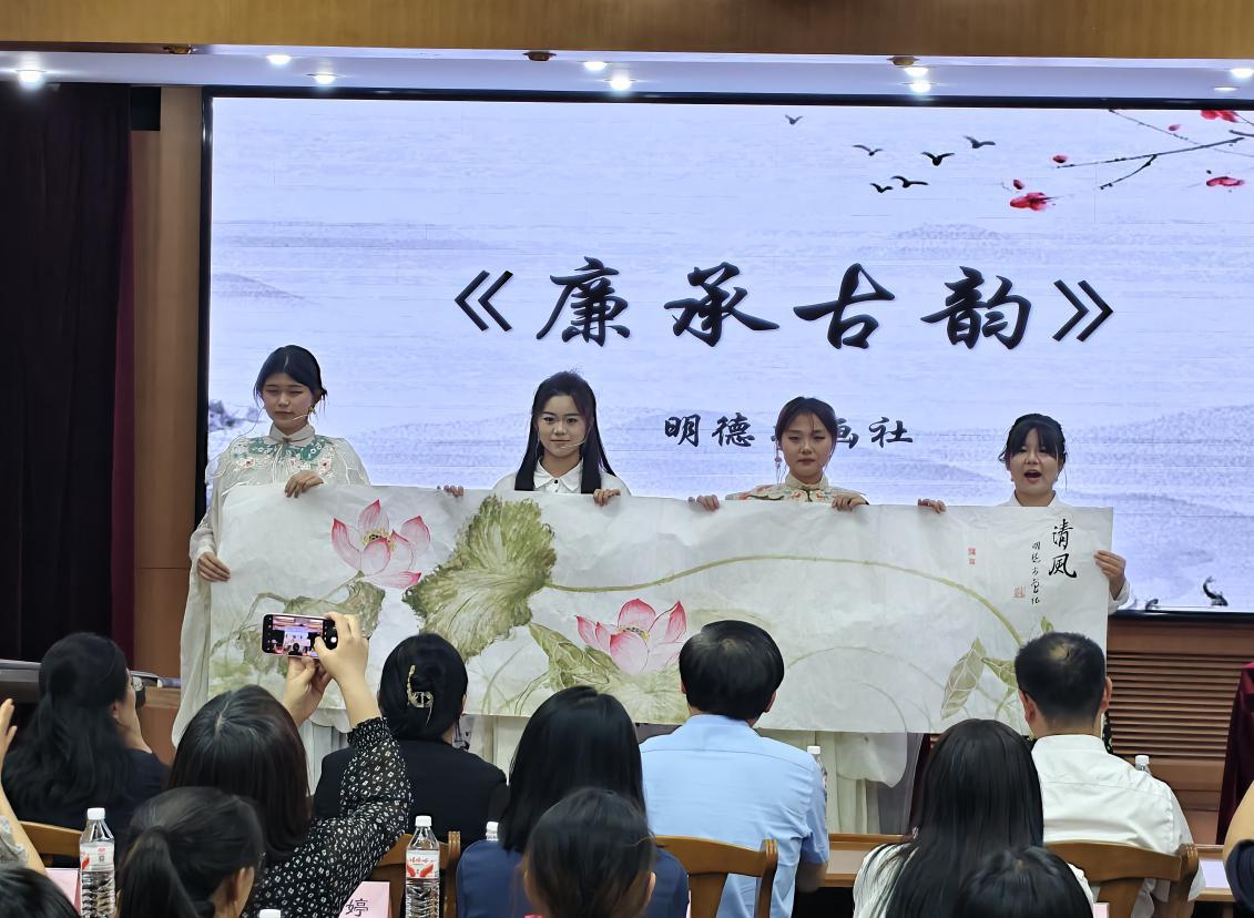 签约仪式后,全体人员共同观看廉洁文化演出,以艺术形式感受廉洁文化的精神内涵。在办公楼二楼的廉洁书画展现场,一幅幅兼具思想性与艺术性的作品,生动展现了廉政建设与传统文化的融合之美。在3号教学楼汉服馆,与会人员了解传统服饰背后的历史典故,感受中华优秀传统文化的魅力。系列文化活动以“党建 + 文化”的形式,为共建活动注入深厚内涵,推动双方在文化传承与廉洁教育领域的合作走向深入。