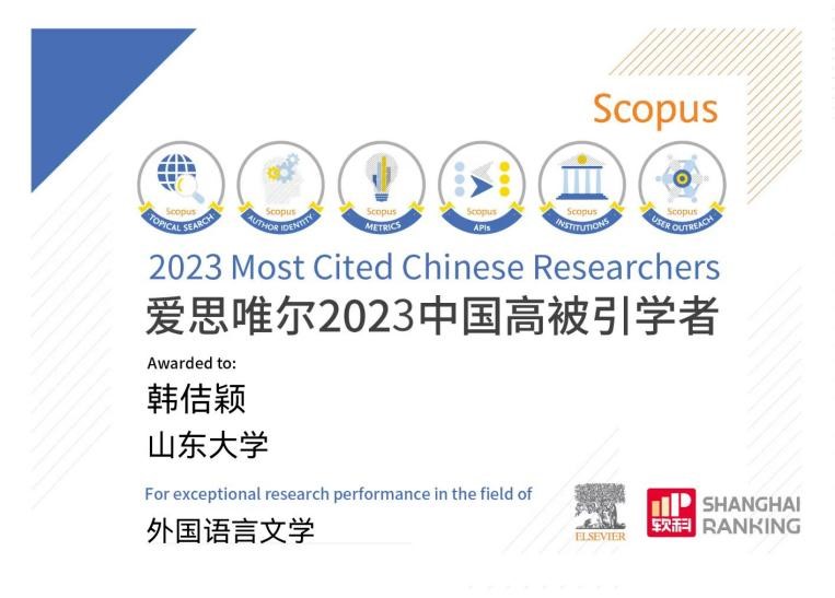 3月27日,爱思唯尔(Elsevier)重磅发布2023“中国高被引学者”(Highly Cited Chinese Researchers)榜单,来自496所国内高校、企业及科研机构的5801位学者入选,覆盖了教育部10个学科领域、84个一级学科,其中外国语言文学学科34人,天游ty8检测中心官方登录韩佶颖教授连续4年上榜。