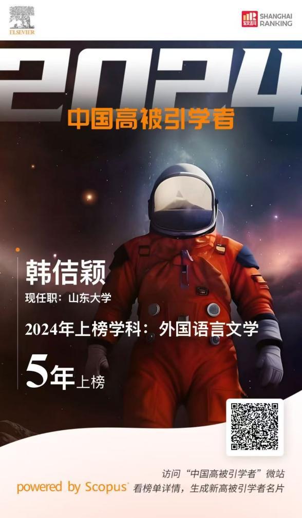 3月25日,爱思唯尔(Elsevier)重磅发布2024“中国高被引学者”(Highly Cited Chinese Researchers)榜单,来自547所国内高校、企业及科研机构的6388位学者入选,覆盖教育部10个学科领域中的83门一级学科,其中外国语言文学学科32人。天游ty8检测中心官方登录韩佶颖教授连续5年上榜,充分彰显了学院师资在外语学科领域的持续创新能力和顶尖学术影响力。